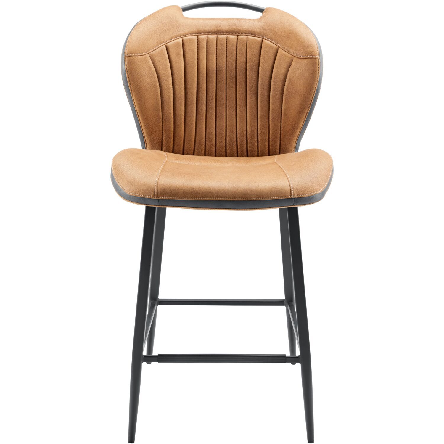 Deze cognackleurige barkruk Tubac combineert een stoer uiterlijk met een heerlijk comfort. De kruk is bekleed met een gladde stof die een zichtbare leernerf heeft en aangenaam zacht aanvoelt. Over de rand van de zitting en de rugleuning loopt een antracietkleurige band. Samen met de sierstiksels in de rugleuning, de zwart metalen hoekige poten en de geïntegreerde handgreep, geeft dit de barkruk een industriële uitstraling.
