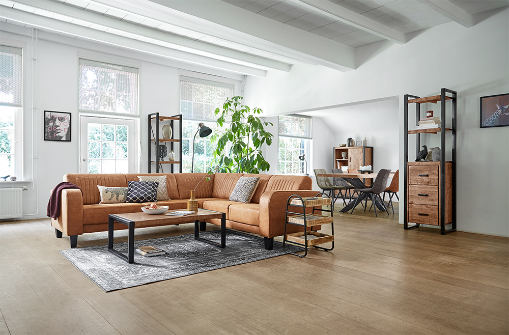 De ultieme industriële combi is hout en staal. Het heeft een robuuste uitstraling en zien we zowel terug in meubels als woonaccessoires. Denk maar eens aan een grote eettafel met een blad van steigerhout en grove zwarte stalen poten. Of wat minder groots maar net zo stoere salontafels. Maak je wand af met een krachtige open kast met mooie natuurlijk houten planken en stevige poten.