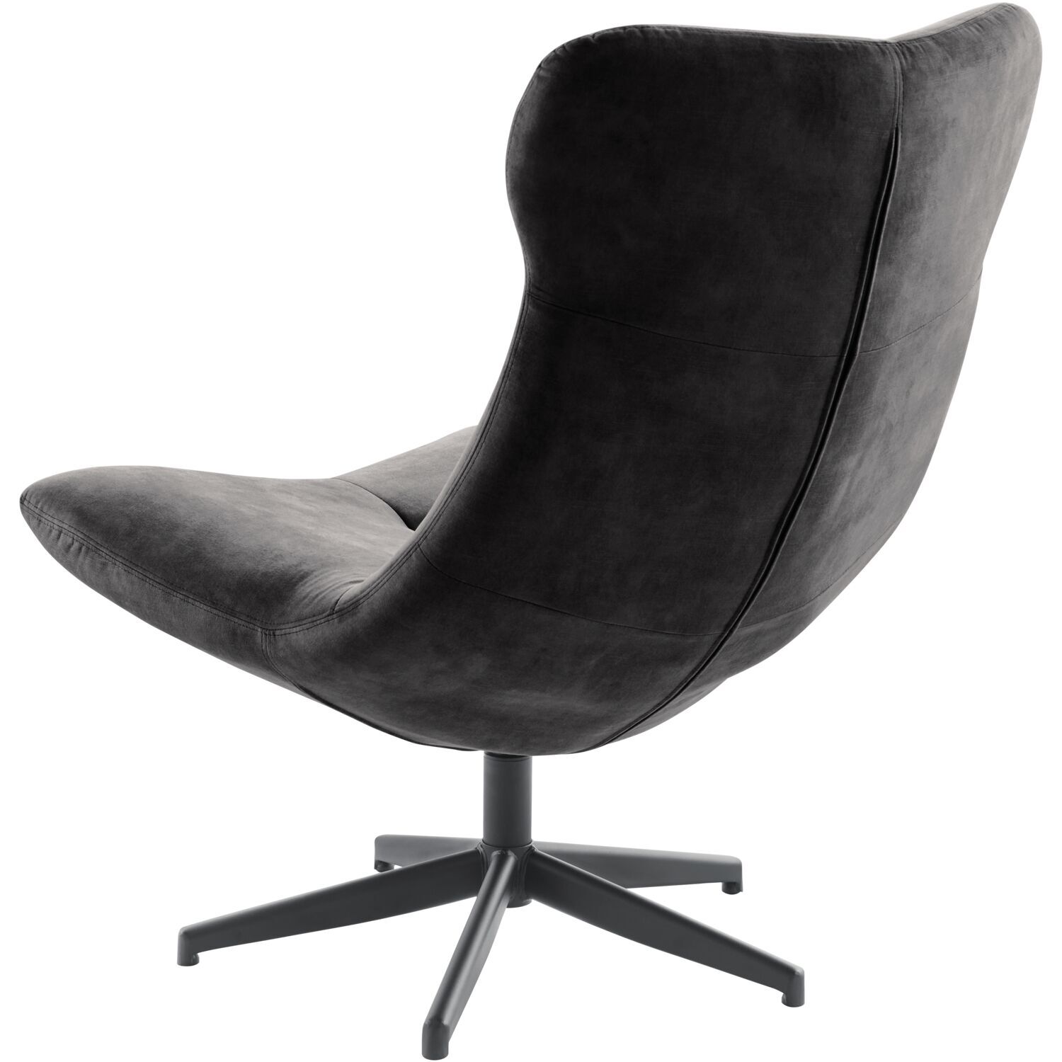 De draaifauteuil is uitgevoerd in een donkergrijze velvetstof met een luxe en warme uitstraling. Hierdoor oogt de fauteuil niet alleen zacht en warm, zo voelt hij ook. Zowel de zitting als de rug is voorzien van een speels sierstiksel.