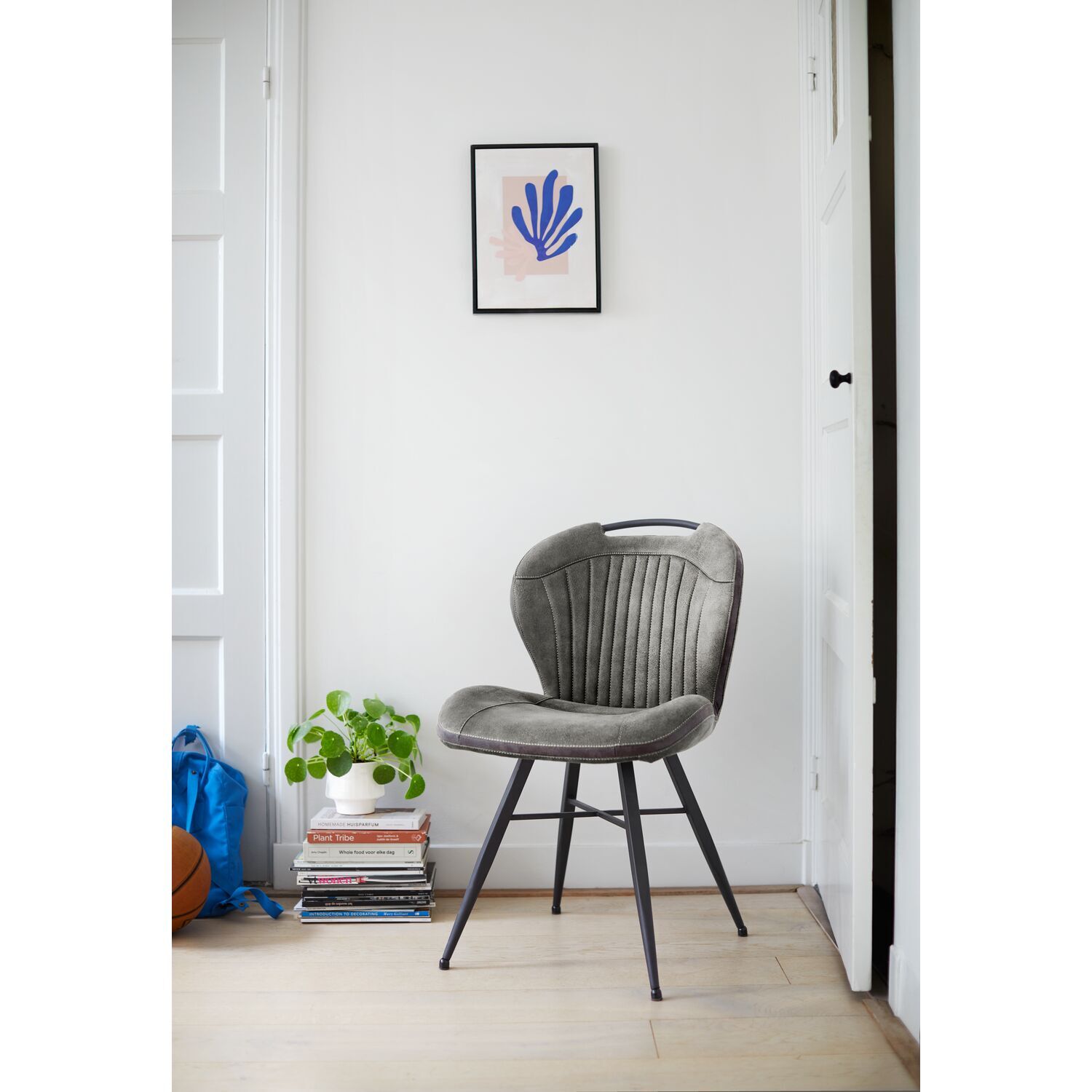 Stoel Maleo is uitgevoerd in stof zorro in de kleur grijs. Stof zorro is een gladde, luxe stof met een zichtbare leernerf en voelt aangenaam zacht aan. In combinatie met de sierstiksels in de rugleuning en de zwart metalen poten, krijgt de stoel een industriële uitstraling.