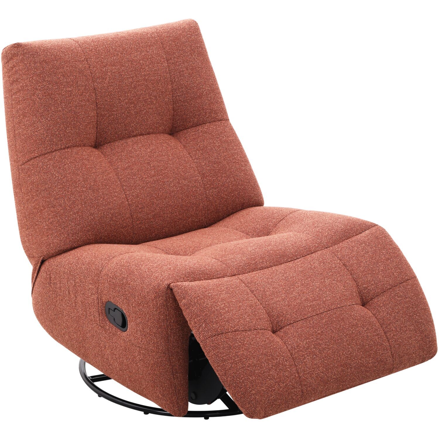Relaxfauteuil Redan is uitgevoerd in een roestkleurige weefstof. De sierstiksels die verwerkt zijn op de gehele fauteuil zorgen voor een speels effect. De zwarte metalen ronde draaivoet staat zo dicht op de fauteuil zelf, dat het vanuit bepaalde hoeken lijkt alsof de fauteuil zweeft.