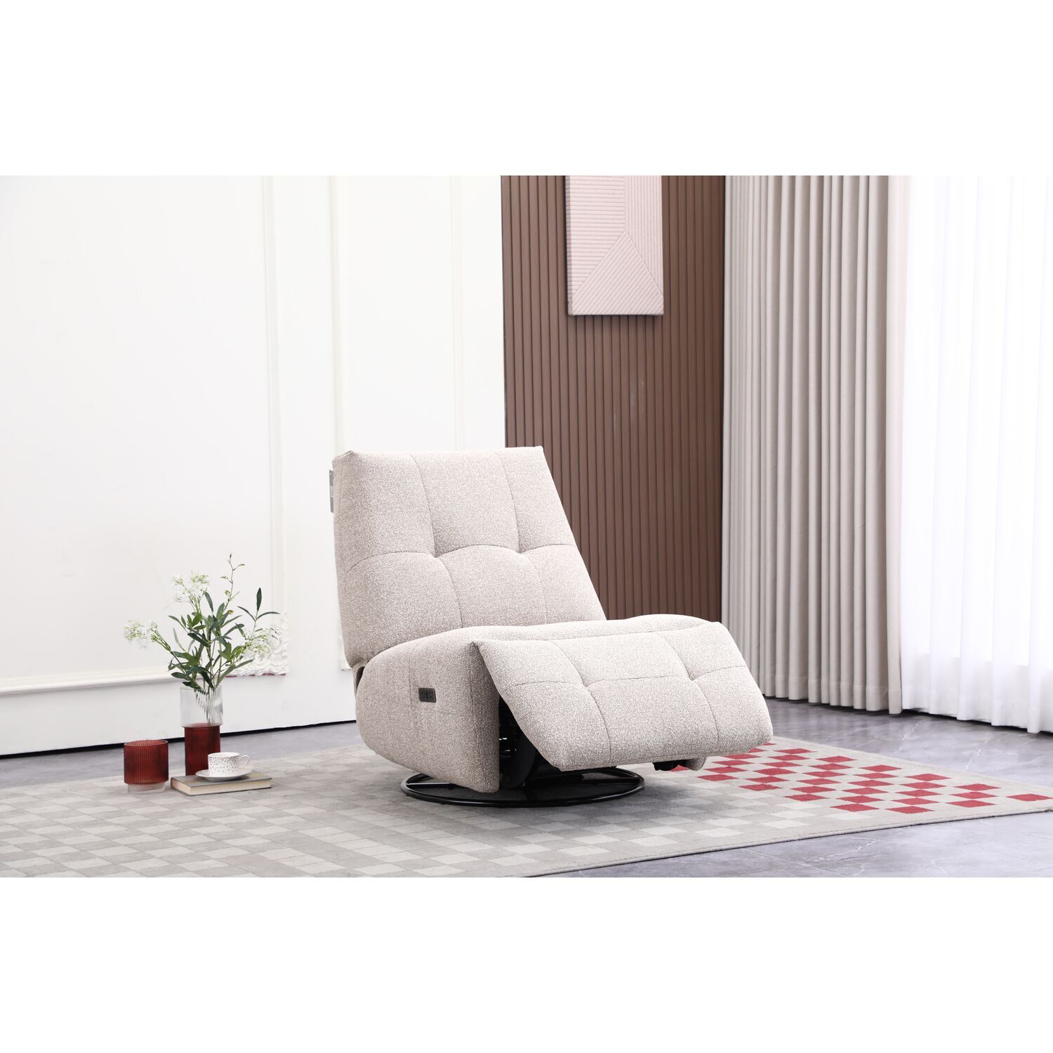 | Uitvoering | Elektrisch verstelbaar, uitgevoerd in stof majestic weave beige met zwart metalen ronde draaivoet. |