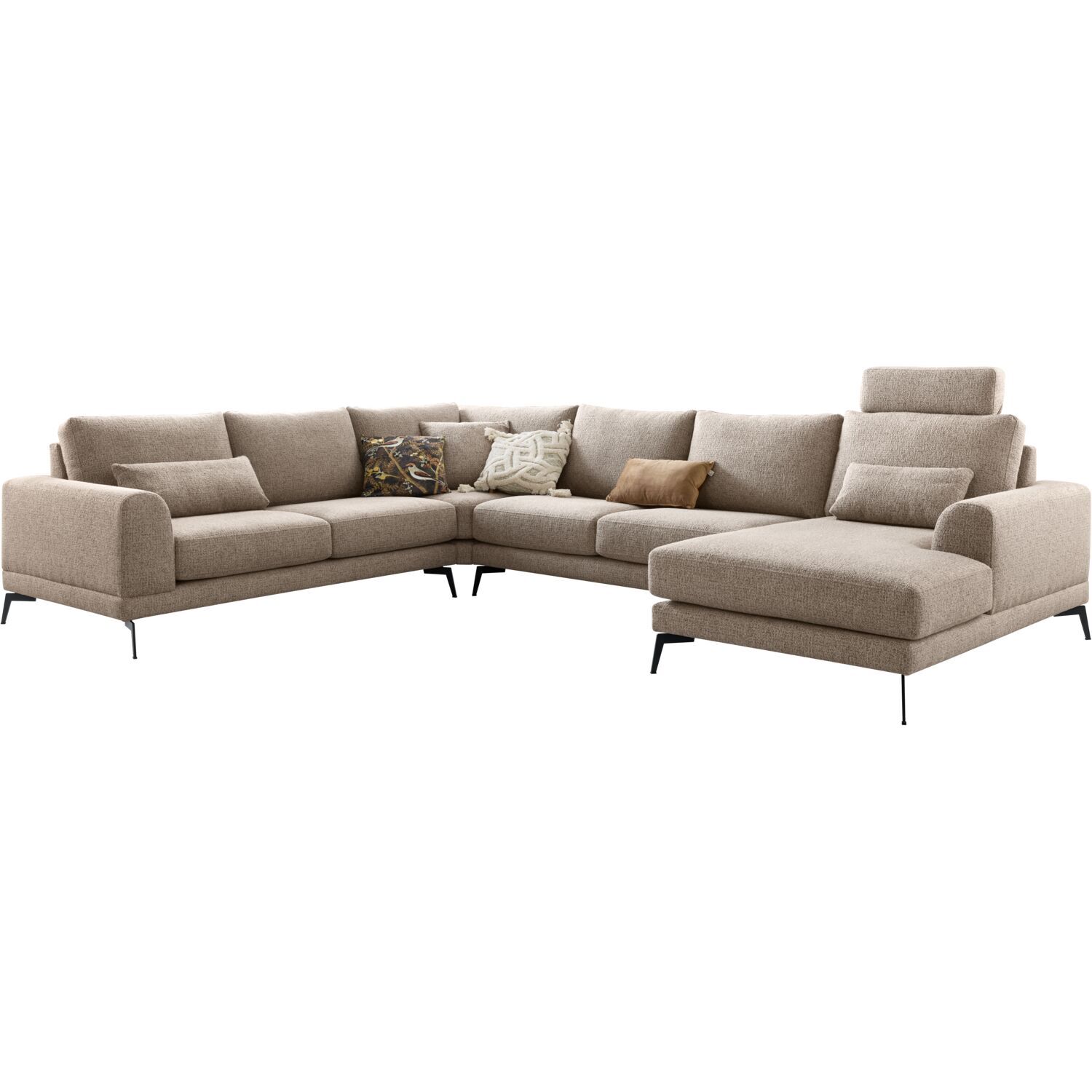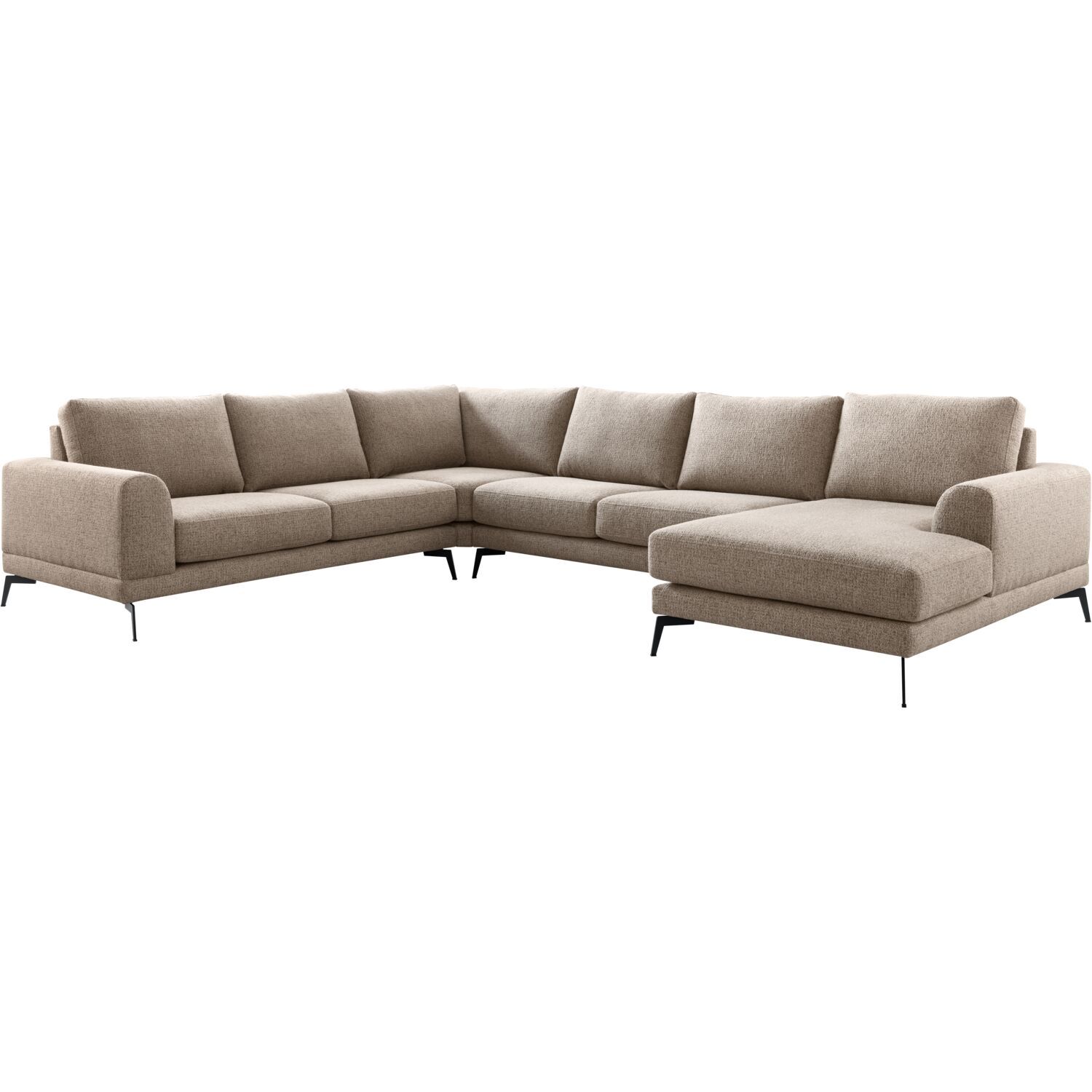 | Uitvoering | 2,5 zits arm links + hoekelement + 2,5 zits zonder armen + chaise longue arm rechts uitgevoerd in stof taurus 109-desert met polyetherschuim met een toplaag van HR-koudschuim in de zitting, een mix van polyetherschuim- en siliconenvlokken in de rug en zwarte metalen poten, type M-15 (hoogte 15 cm). |