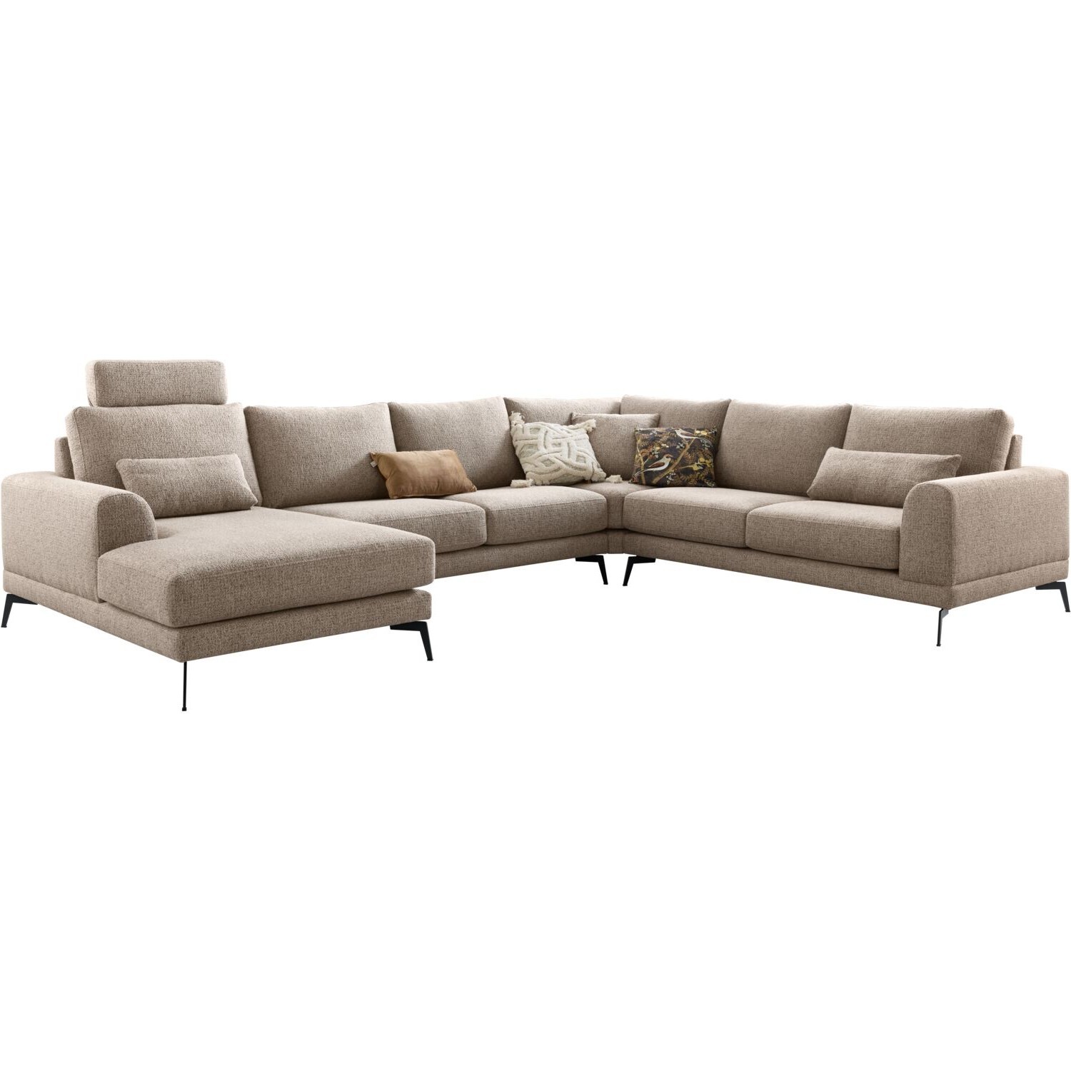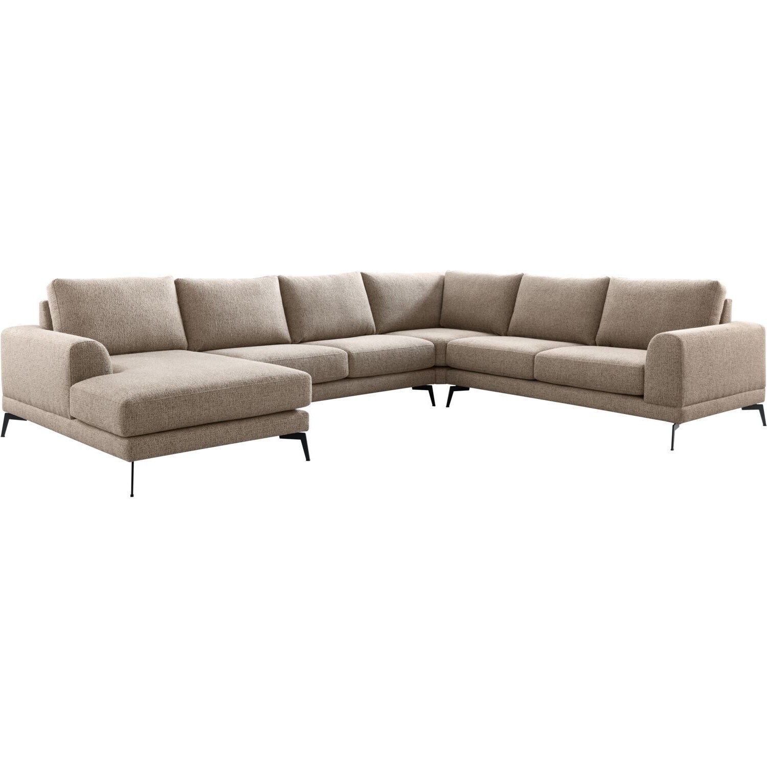 | Uitvoering | Longchair arm links + 2,5 zits zonder armen + hoekelement + 2,5 zits arm rechts uitgevoerd in stof taurus 109-desert met pocketvering met een toplaag van traagschuim in de zitting, HR-koudschuim en een mix van siliconenvlokken en donsveren in de rug en zwarte metalen poten, type M-15 (hoogte 15 cm). |