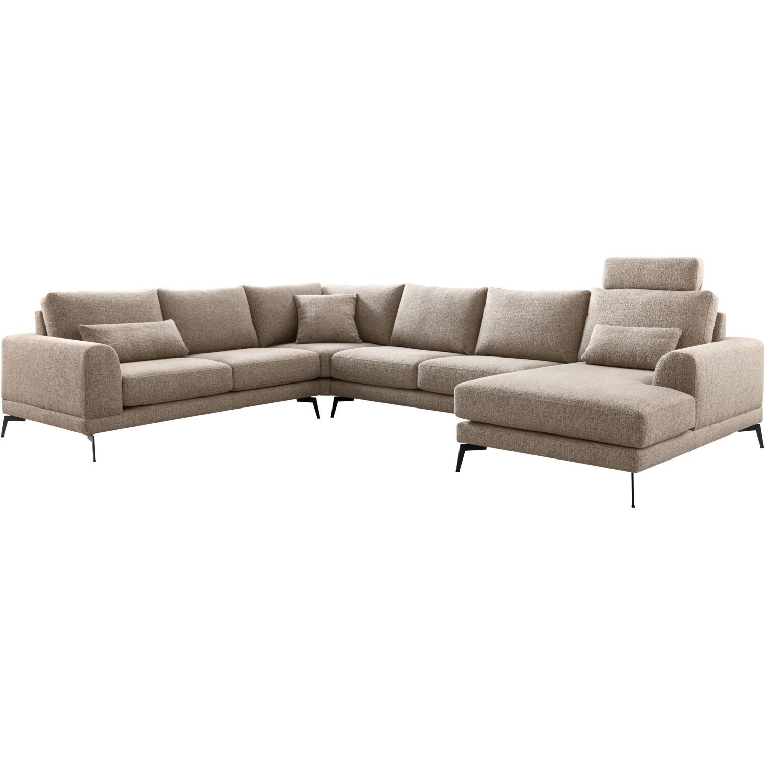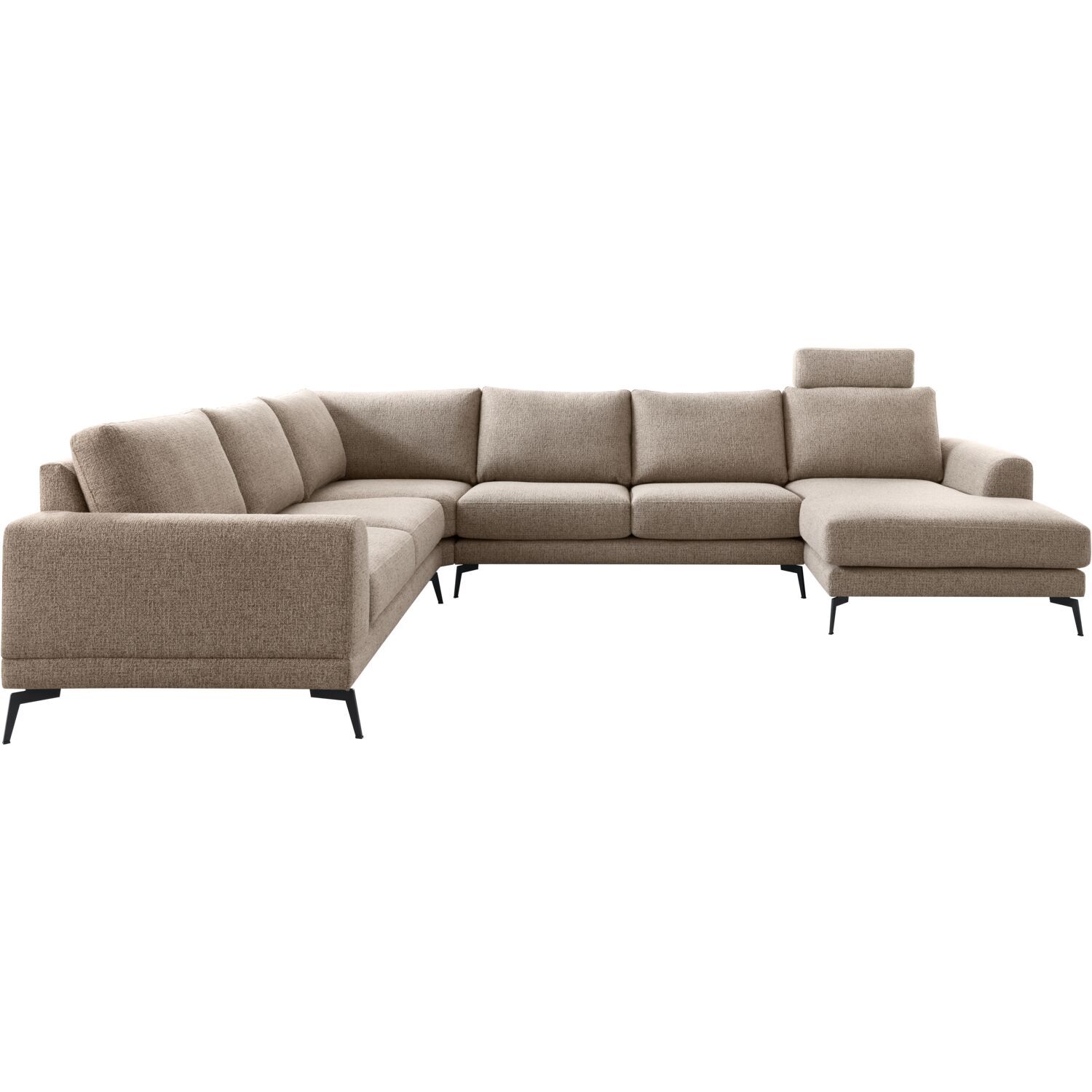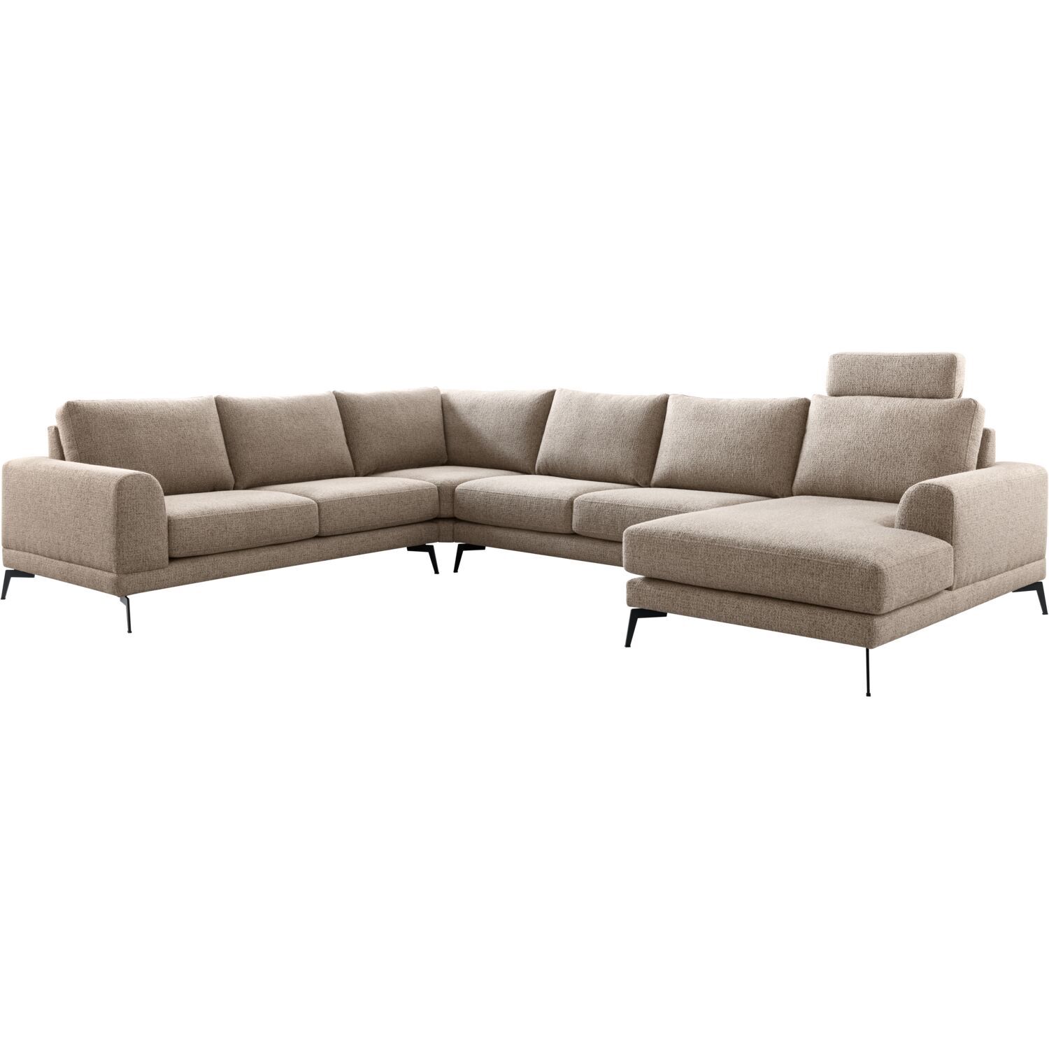 | Uitvoering | 2,5 zits arm links + hoekelement + 2,5 zits zonder armen + chaise longue arm rechts uitgevoerd in stof taurus 109-desert met verstelbare hoofdsteun 60, polyetherschuim met een toplaag van HR-koudschuim in de zitting, een mix van polyetherschuim- en siliconenvlokken in de rug en zwarte metalen poten, type M-15 (hoogte 15 cm). |
