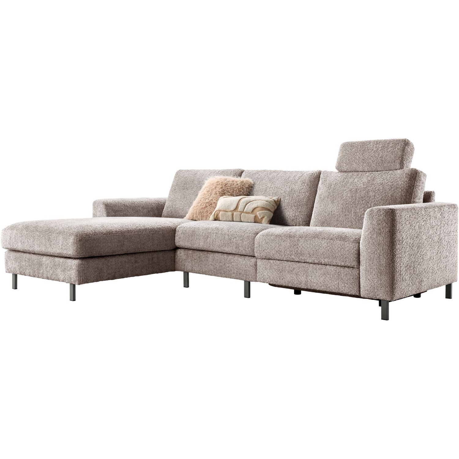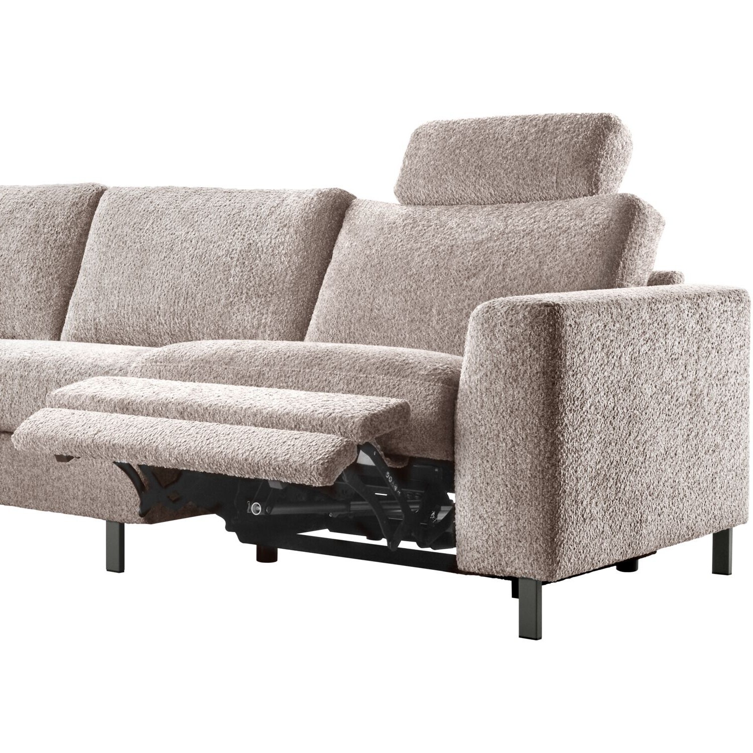 | Uitvoering | Longchair groot arm A links + 1 zits (80) zonder armen + 1 zits (80) arm A rechts met elektrische relaxfunctie en hoofdsteun 60 (met beugel in de kleur perle brown), uitgevoerd in stof venga 12-taupe met polyetherschuim in de zitting, een mix van polyetherschuim- en siliconenvlokken in de rug en metalen poten type MF5 in de kleur perle brown (hoogte 12 cm). |