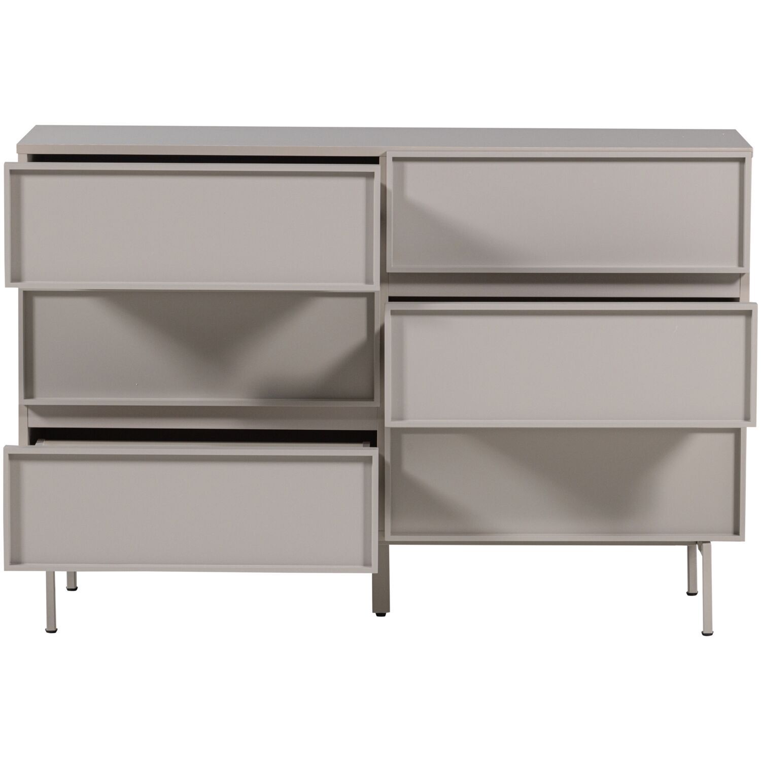 | Uitvoering | Uitgevoerd in melamine in de kleur sand met 6 laden en zandkleurige metalen poten. |