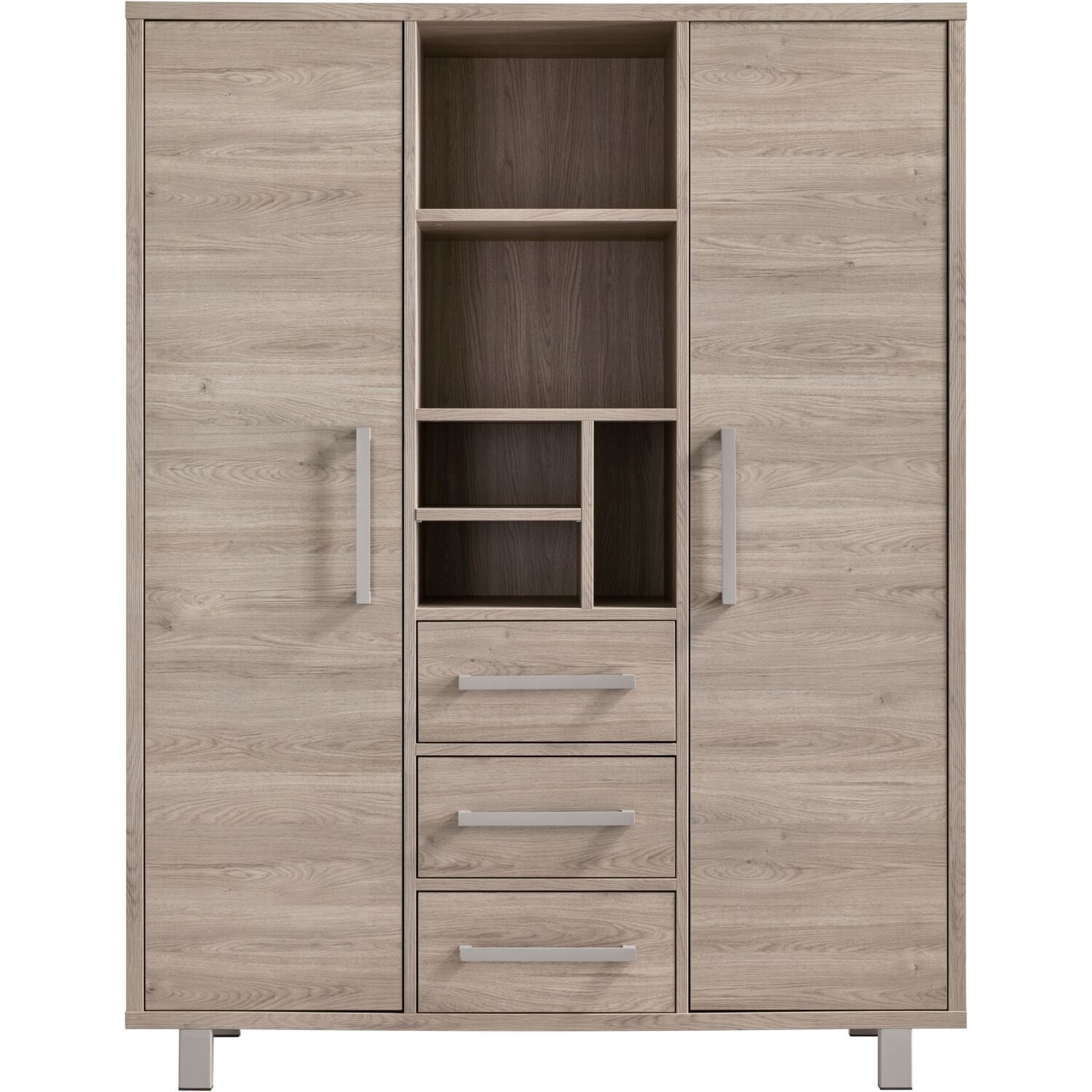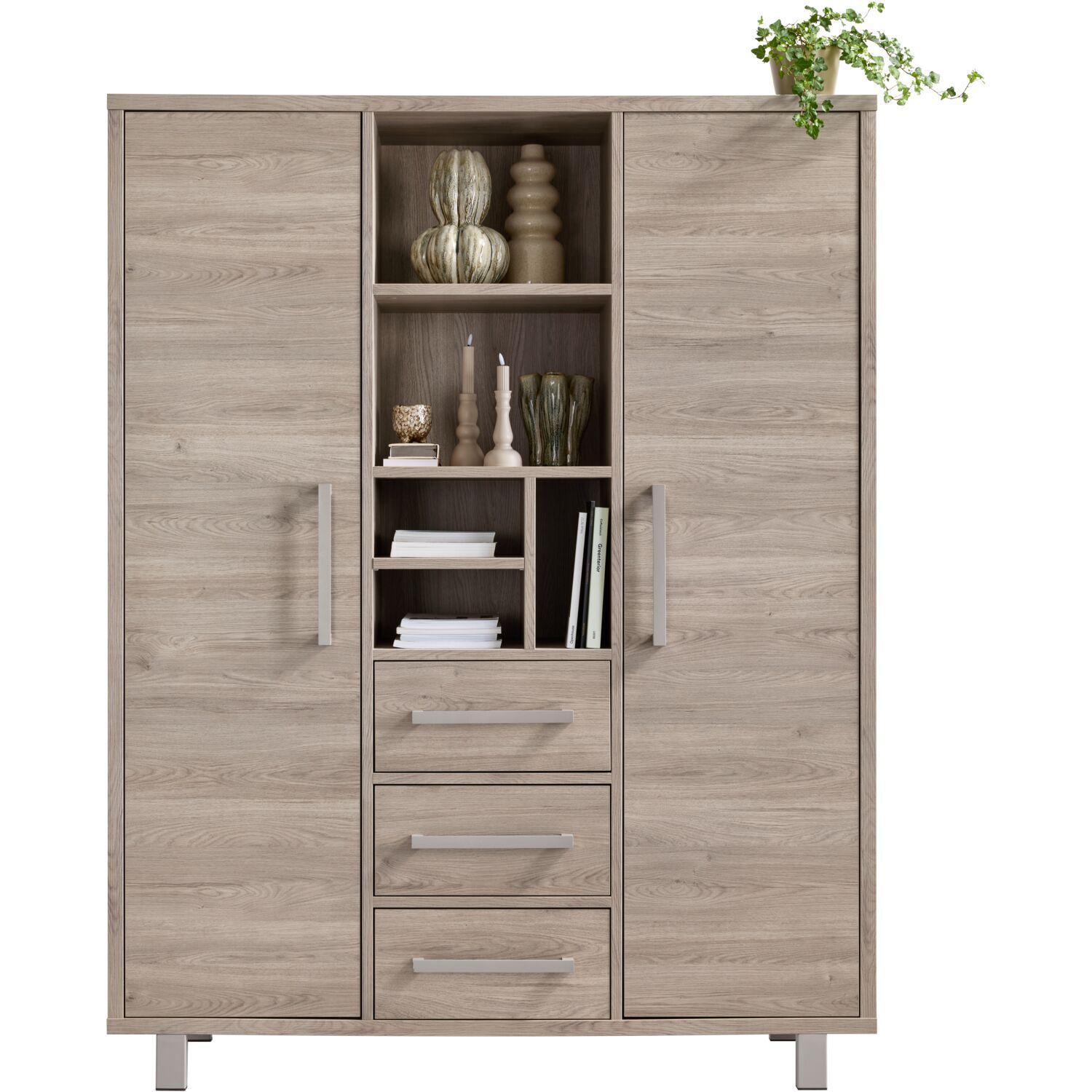 | Uitvoering | Uitgevoerd in de kleur grey oak met metalen handgrepen en poten in de kleur stone grey, met 2 deuren, 3 laden en 5 open vakken. |