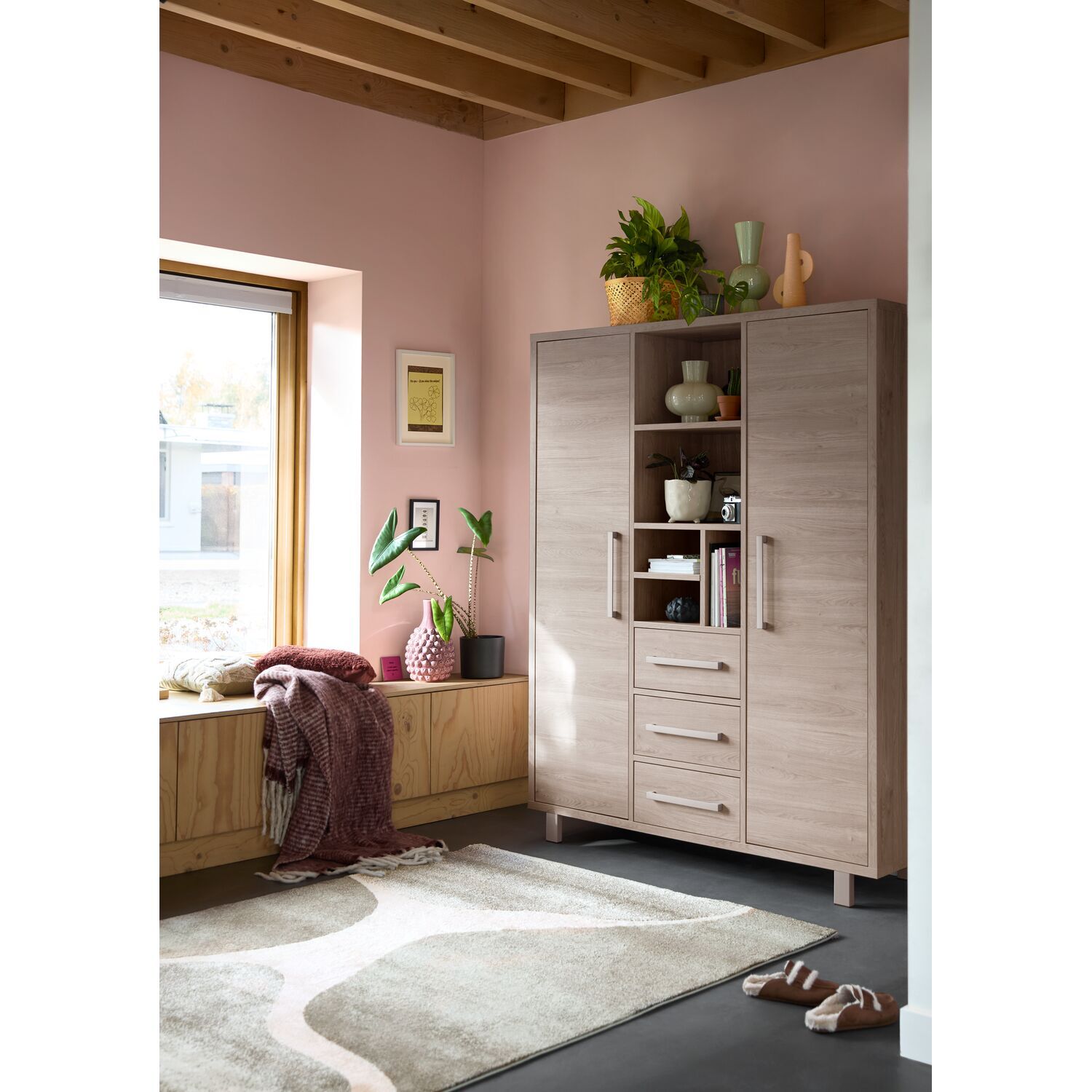 Moderne opbergkast met een strak uiterlijk. De mooie kleur grey oak en het gepoedercoate lichtgrijze metalen frame geven je interieur een unieke, zachte sfeer.