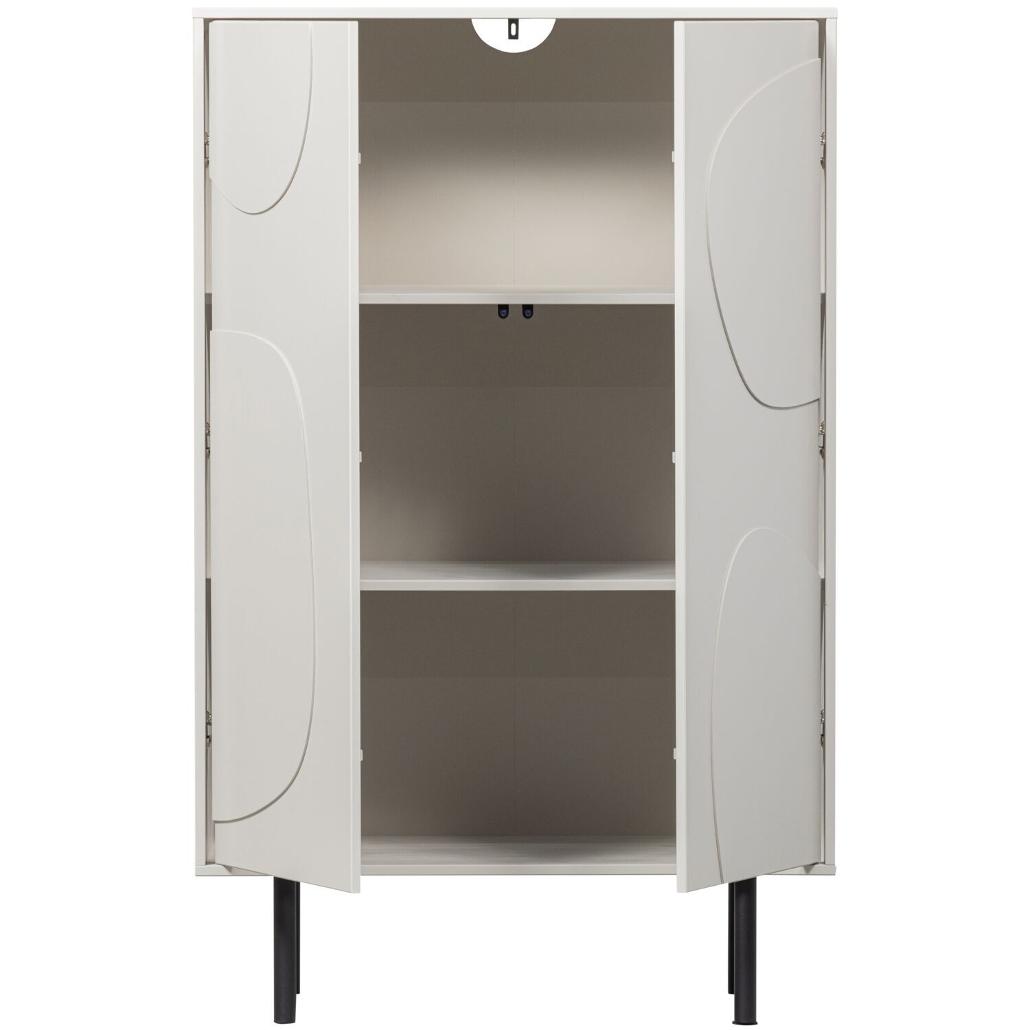 Opbergkast Cadiz heeft een clean design, speels houtpatroon en een sprekend kleurcontrast. De mistwitte afwerking houdt het ontwerp stijlvol en modern met als spannende tegenhanger de stoere, stevige zwarte poten. Kortom, een echte eyecatcher voor in je interieur! De kast is gemaakt van grenenhout.